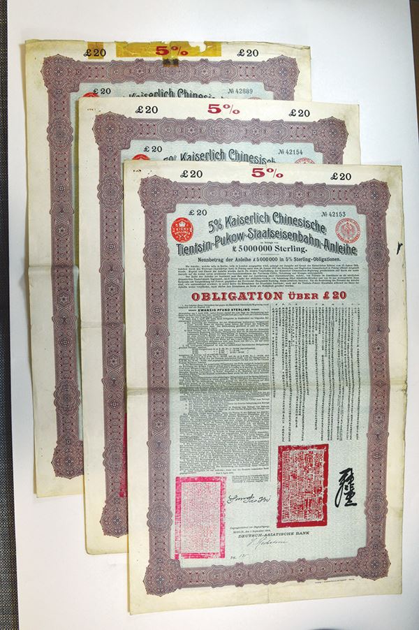China. Deutsch-Asiatische Bank. 1908. 20 Pounds. Large format no coupons. Very Fine, some edge roughness. 3 pieces.