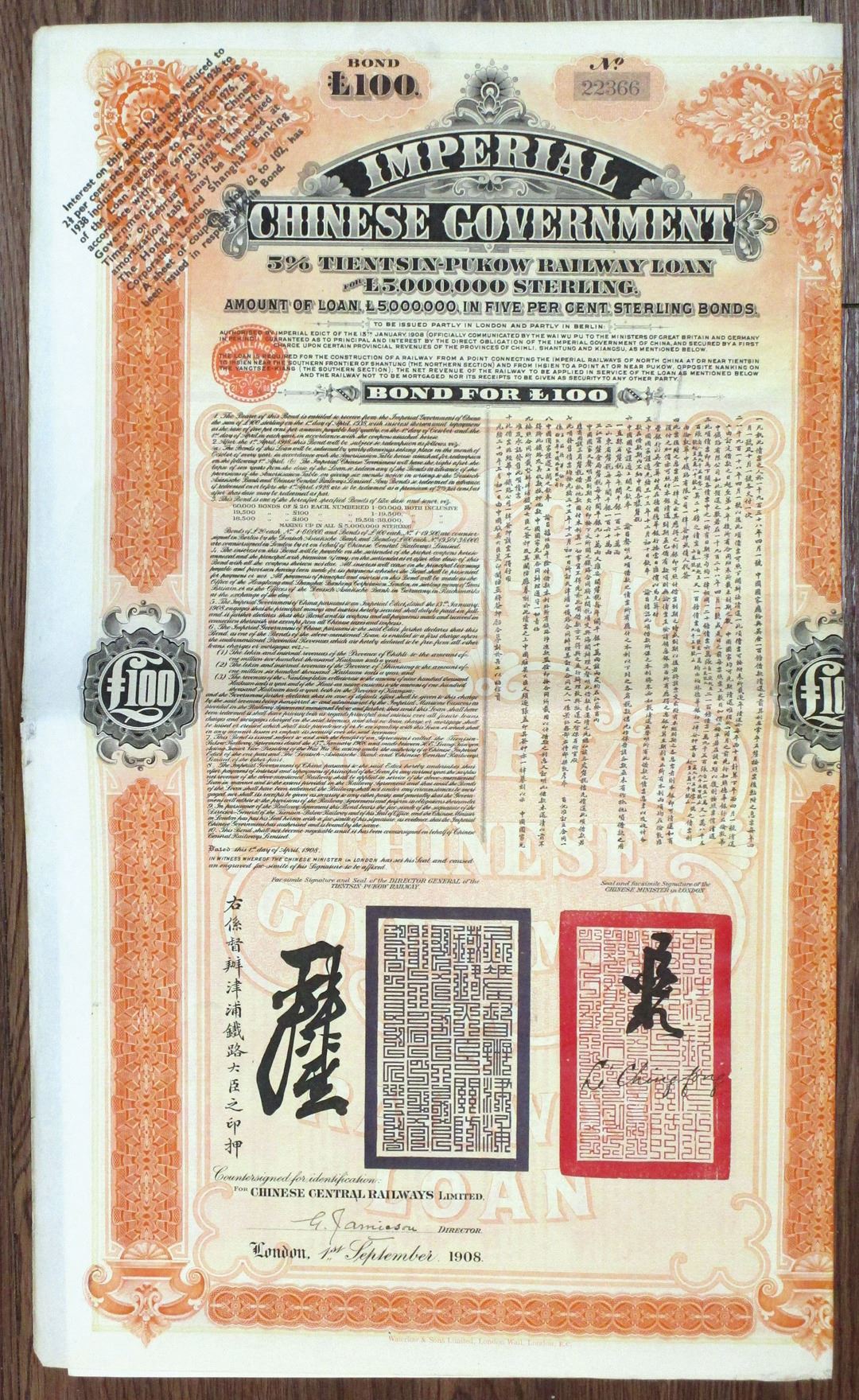 China, 1908. £100 I/U 5% Tientsin-Pukow Railway Coupon Bond, Black text with orange border and undertint. British tax stamp and a 1936 loan modification imprint at top right. VF condition with some writing in pencil, staple holes, staining, and rough edges. W&S.