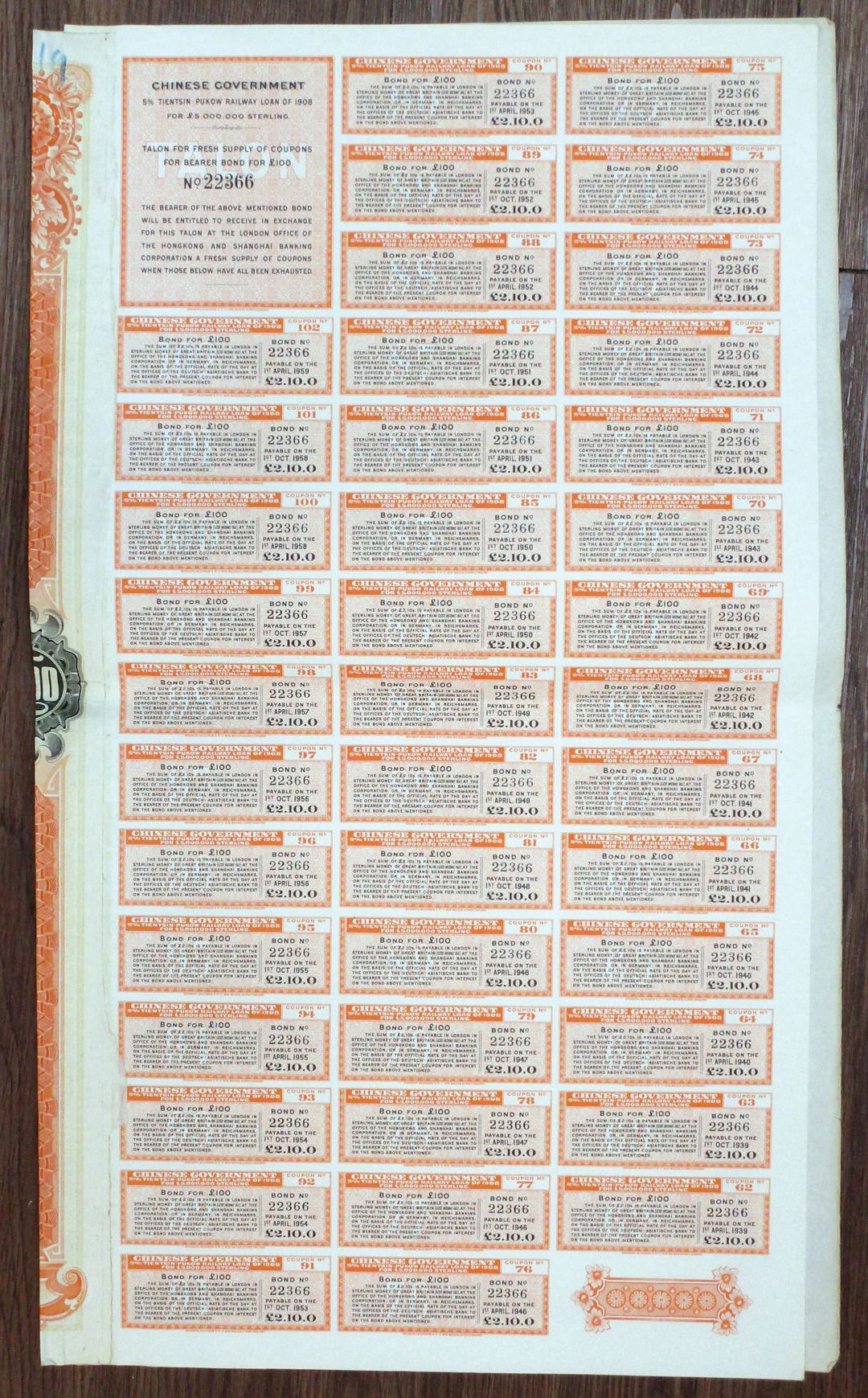 China, 1908. £100 I/U 5% Tientsin-Pukow Railway Coupon Bond, Black text with orange border and undertint. British tax stamp and a 1936 loan modification imprint at top right. VF condition with some writing in pencil, staple holes, staining, and rough edges. W&S.