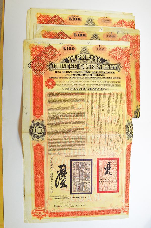 Issued by the Chinese Central Railways Ltd. London. 100 Pounds. Orange border. English and Chinese text. With coupons. 3 pieces.