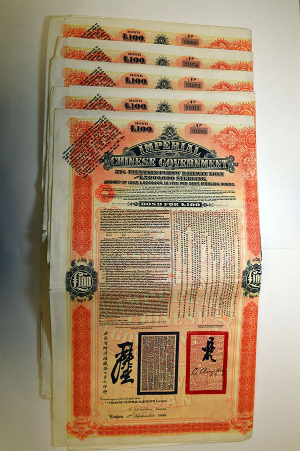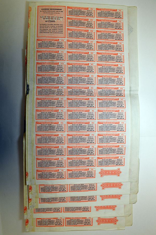 Issued by the Chinese Central Railways Ltd. London. 100 Pounds. Orange border. English and Chinese text. With coupons. 5 pieces.