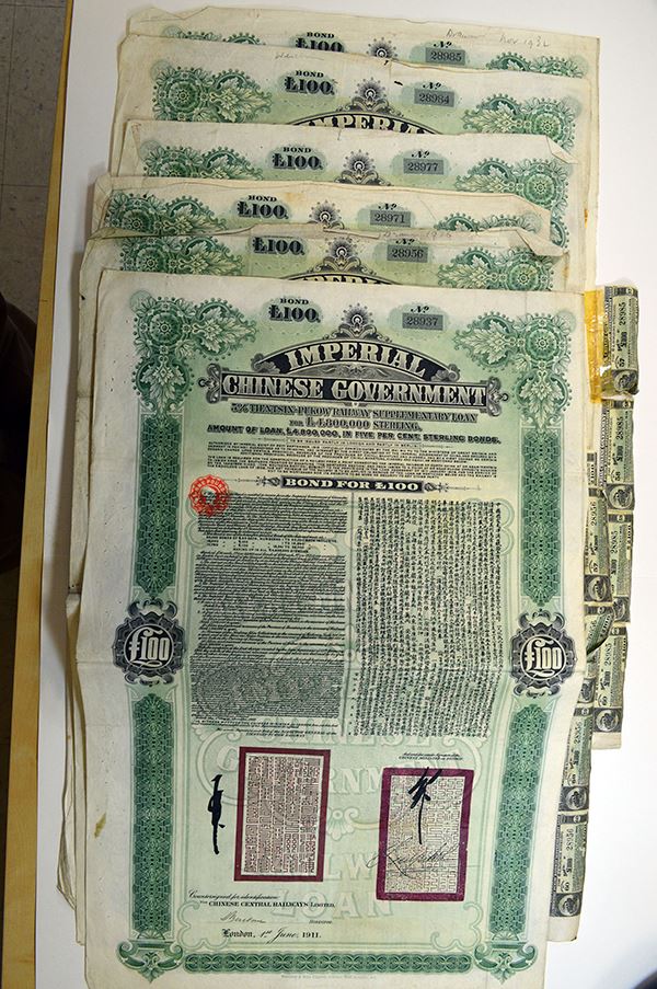 Issued by the Chinese Central Railways Ltd. London. 100 Pounds. Green border. English and Chinese text. With coupons. 6 pieces.