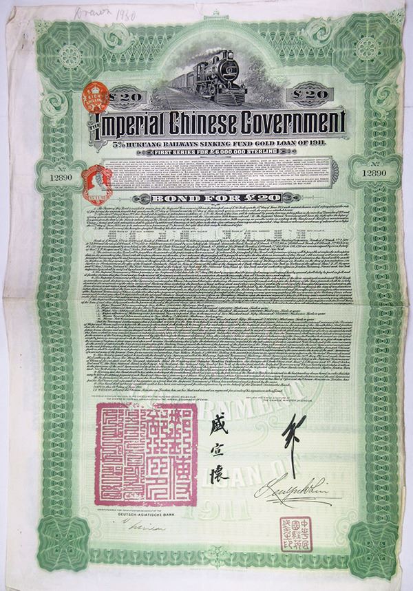 China. £20, I/U, green border and under print with locomotive on top. Fine-VF condition with a couple of coupons missing. Printed in London with Waterlow & Sons, LTD.