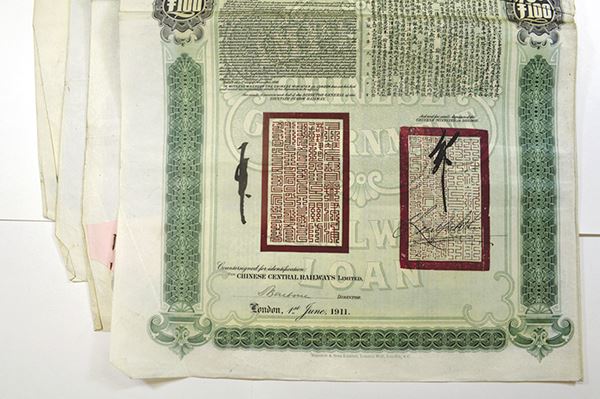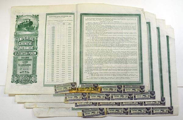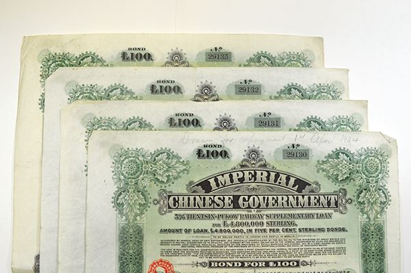 China, 100 Pounds. Green border and underprint. Chinese Central Railways Ltd. 4 coupons. Fine - Very Fine. 4 pieces.