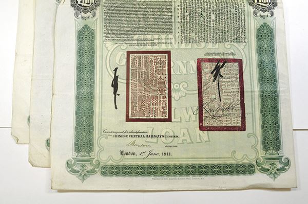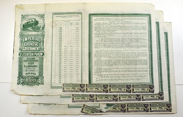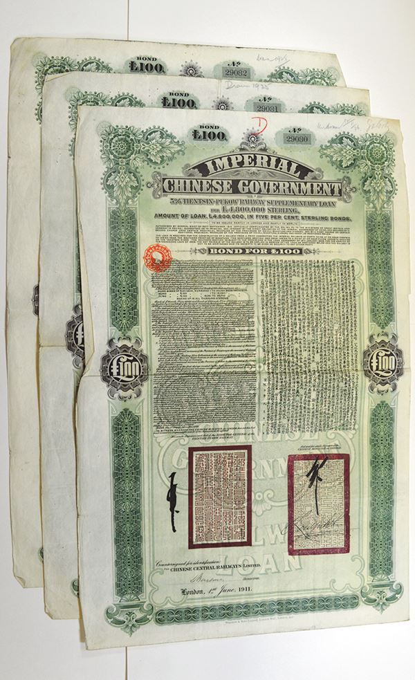 China, 100 Pounds. Green border and underprint. Chinese Central Railways Ltd. 4 coupons. Very Good, rough edges. 3 pieces.