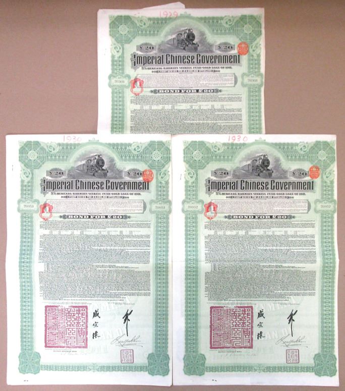 China, 1911. Lot of 3 £20 I/U 5% Sinking Fund Gold Coupon Bond, Black text with green border and background, Train approaching on tracks at top center. German stamp crossed out in black. Fine-VF condition with staple holes. Waterlow & Sons Ltd. Issued by Deutsch-Asiatische Bank. (3). Sold "AS IS" no returns accepted.