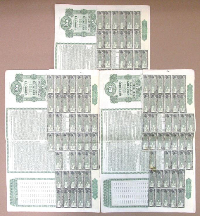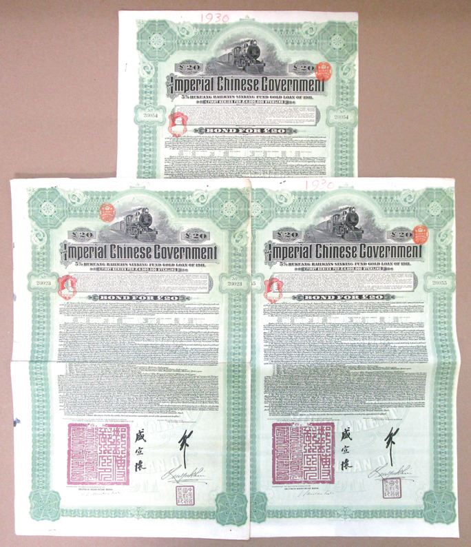 China, 1911. Lot of 3 £20 I/U 5% Sinking Fund Gold Coupon Bond, Black text with green border and background, Train approaching on tracks at top center. German stamp crossed out in black. Fine-VF condition with staple holes. Waterlow & Sons Ltd. Issued by Deutsch-Asiatische Bank. (3). Sold "AS IS" no returns accepted.