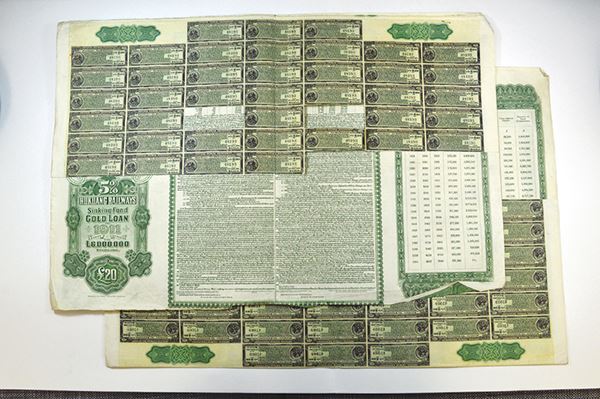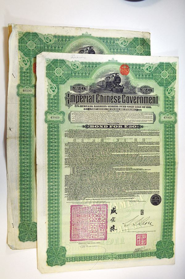 China. Banque de L'Indo Chine in Paris. 20 Pounds. Large format with coupons. Very Fine, some edge roughness. 2 pieces