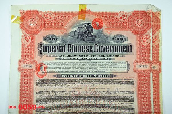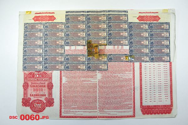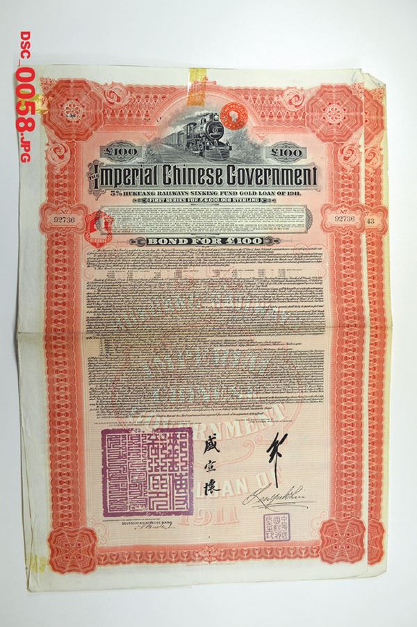 China. Deutsch-Asiatische Bank. Red border and underprint. Nice steam locomotive at top center. With Coupons, German and British tax stamps. Large format, rough handling. 2 pieces.