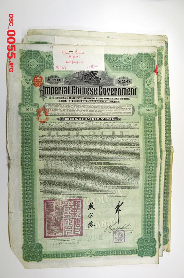 China. Deutsch-Asiatische Bank. Green border and underprint. Nice steam locomotive at top center. With Coupons, German and British tax stamps. Large format, rough handling. 3 pieces.