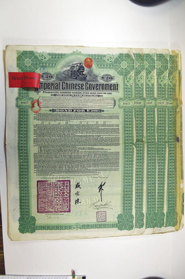 China - Imperial. 20 Pounds. Deutsch-Asiatische Bank. With additional British, German and Belgium tax stamps. With Bond Drawn red stickers. Coupons attached. Fine. 5 pieces.
