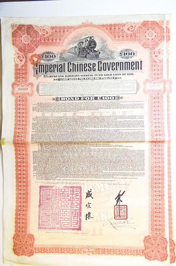 China. £100 Issued 5% Sinking Fund Gold Coupon Bond, Black print on large ornate red/orange border and under tint, Locomotive at top above company title, Fine-VF condition. W&S. 2 Pieces.