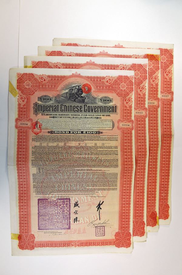China, Imperial. 100 Pounds. Red border. German and British tax stamps in combination. Great locomotive vignette at top center. Coupon page attached. Very Fine, some edge roughness. 3 pieces.