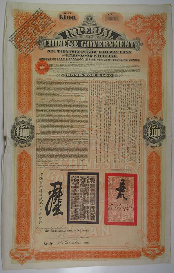 Imperial China, 1908. £100 I/U 5% Sterling Coupon Bond, Black text with orange border and undertint. Fine condition with worn margins, slight tear along left middle fold. Printed by Waterlow & Sons Ltd.