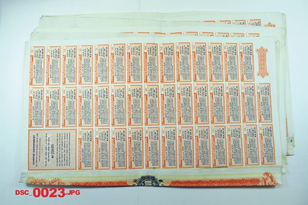 China - Imperial. 100 Pounds. Chinese Central Railways, Ltd. 1908. British tax stamp. Coupons attached. With 1936 interest reduction overprint. Fine-Very Fine. 3 pieces.