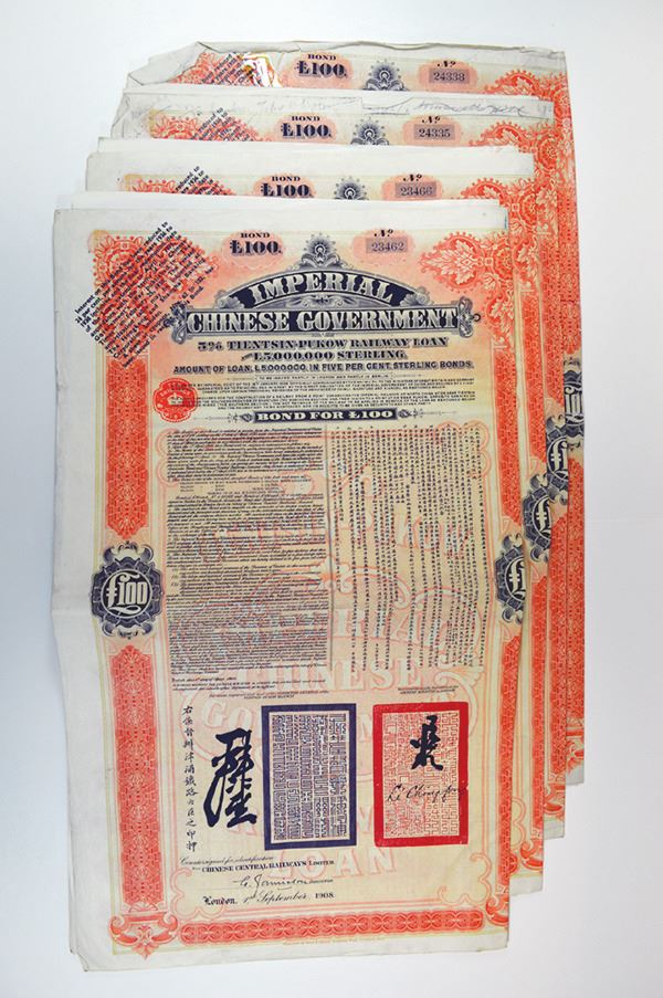 Imperial Chinese Government. 5% Tientsin-Pukow Railway Loan. 1908. Chinese Central Railways.