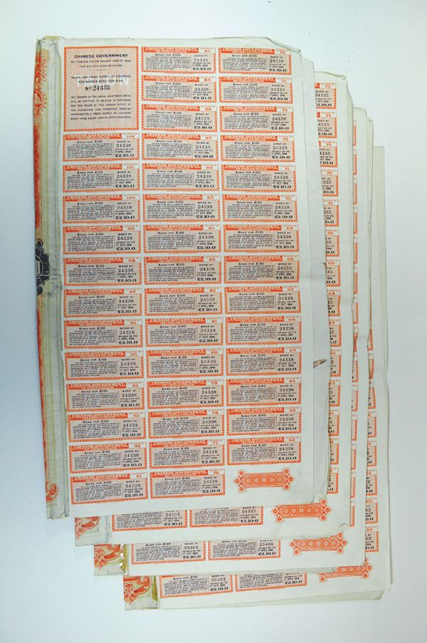 China, Imperial. 100 Pounds. Rose Border. Coupons and tax stamps attached. Very Fine. Rough edges. Overprint notice of 1936. 4 pieces.