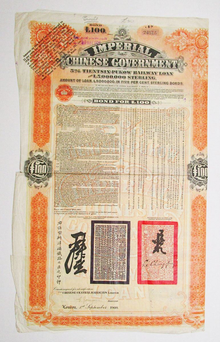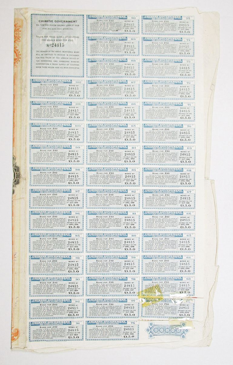 China. £50 over-stamped on £100 I/U, 5% Coupon Loan, Chinese Central Railways, Ltd., British tax stamp on upper left. Coupons attached. S/N 24815. With 1936 interest reduction overprint and partial repayment overprint of £50 dated May 14, 1926. Black on orange-red with curved title. W&S. Rare bond denomination variety.