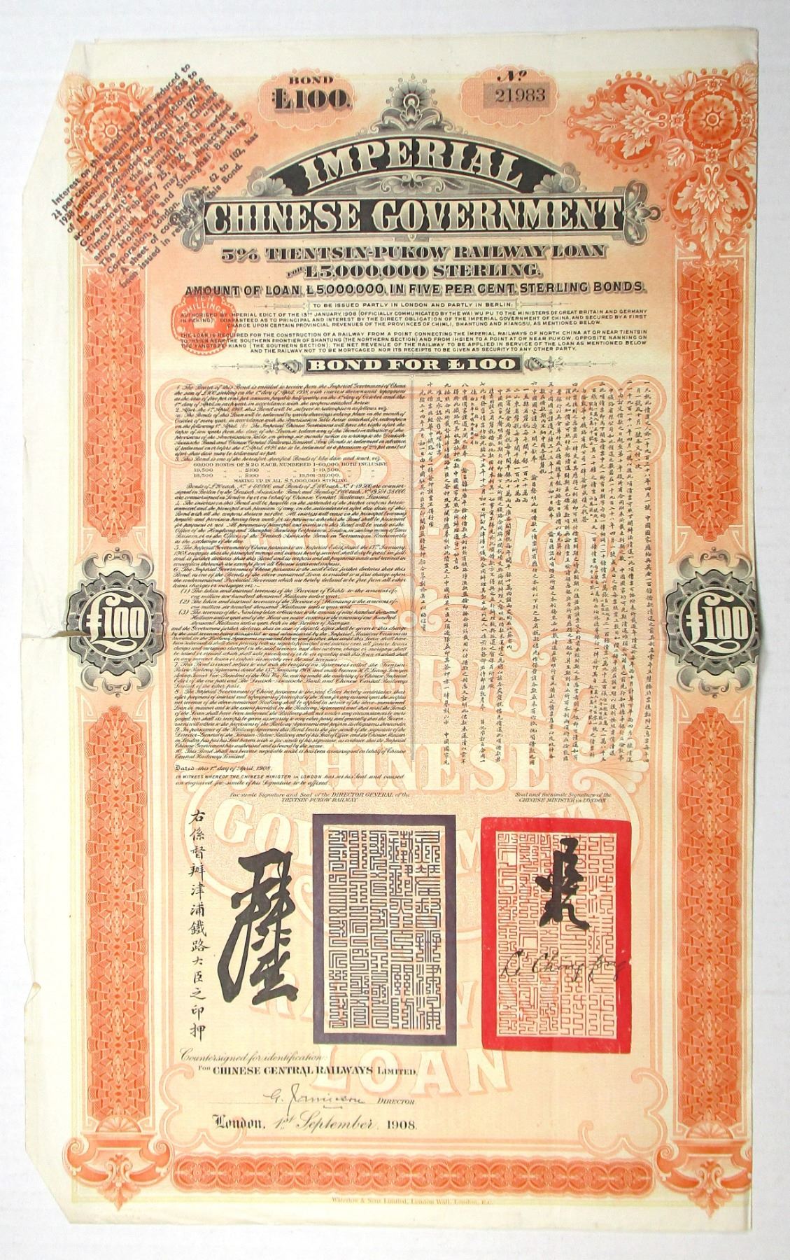 China, 1908. £100 I/U 5% Coupon Bond, Black print on ornate orange border and under tint printed in English and Chinese, Company title at top, VF to XF condition, Waterlow & Sons Ltd.