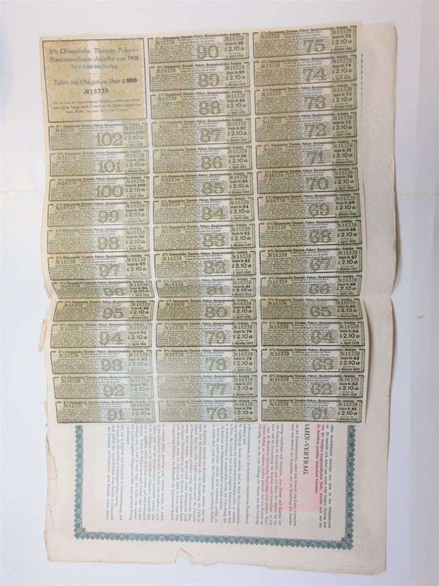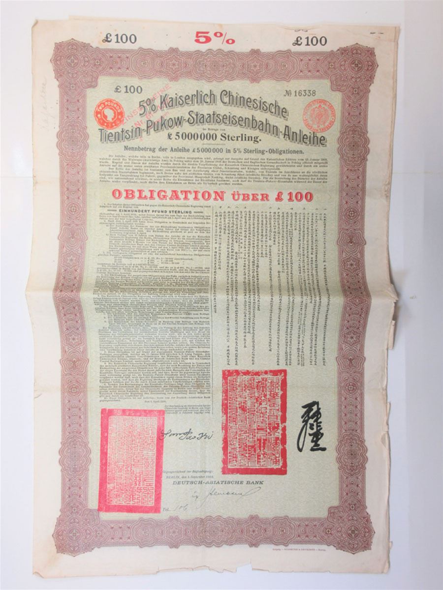 China, 1908. £100, I/U 5% Coupon Bond, Ornate purple border and green underprint with British and German tax stamps at top, Title printed in German, bond printed in German and Chinese, Fine condition with staple holes, minor rust, and some edge roughness. Giesecke & Devrient.
