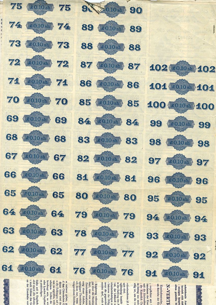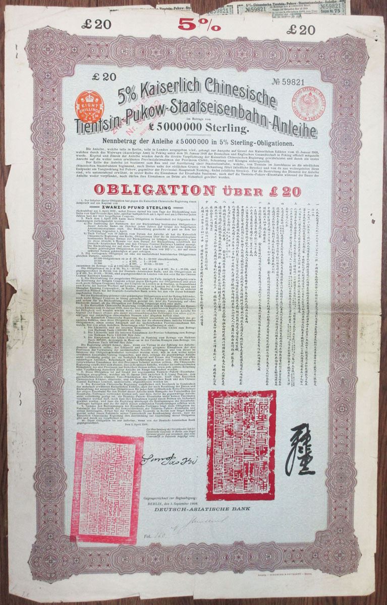 China, 1908. Kaiserlich Chinesische Tientsin-Pukow S.A., £20 I/U 5% Coupon Bond in Chinese and German, Black text with purple border and light blue background. Fine condition with damage to margins and staples.