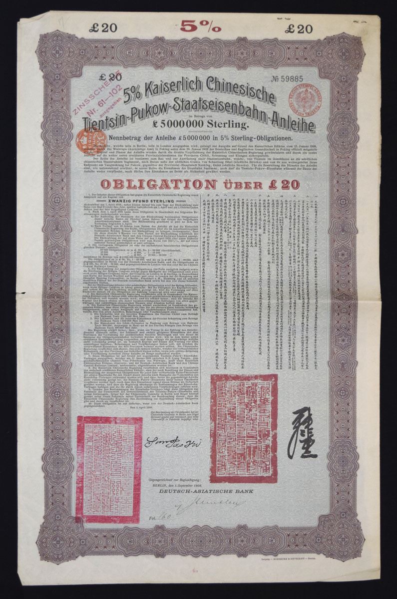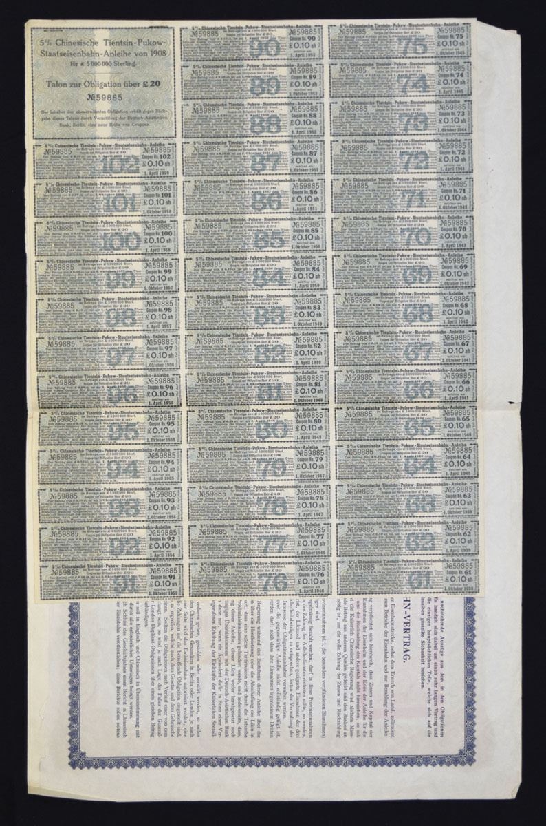 China. 1908, £20 I/U 5% Coupon Bond, lilac border on blue-green under print with coupons. G&D. Very Fine.