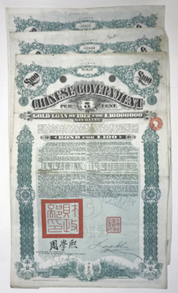 China. Lot of 3 bonds. £20 Issued and Uncancelled Coupon Bond printed in English and French, Large fortress or city on top with green borders and underprint, red seal at bottom, no coupons, Fine+ to VF condition. Attractive bond. W&S.