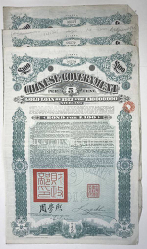 China. Lot of 3 bonds. £20 Issued and Uncancelled Coupon Bond printed in English and French, Large fortress or city on top with green borders and underprint, red seal at bottom, no coupons, Fine+ to VF condition. Attractive bond. W&S.