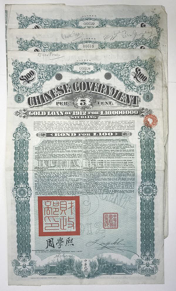 China. Lot of 3 bonds. £20 Issued and Uncancelled Coupon Bond printed in English and French, Large fortress or city on top with green borders and underprint, red seal at bottom, no coupons, Fine+ to VF condition. Attractive bond. W&S.