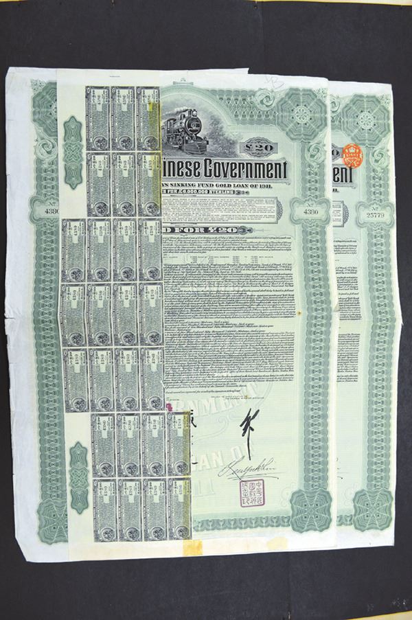China - Imperial. 20 Pounds. Deutsch-Asiatische Bank. German and British tax stamps. Coupons attached. Nice steam locomotive at top. Very Fine. 2 pieces.