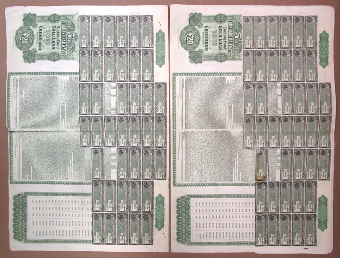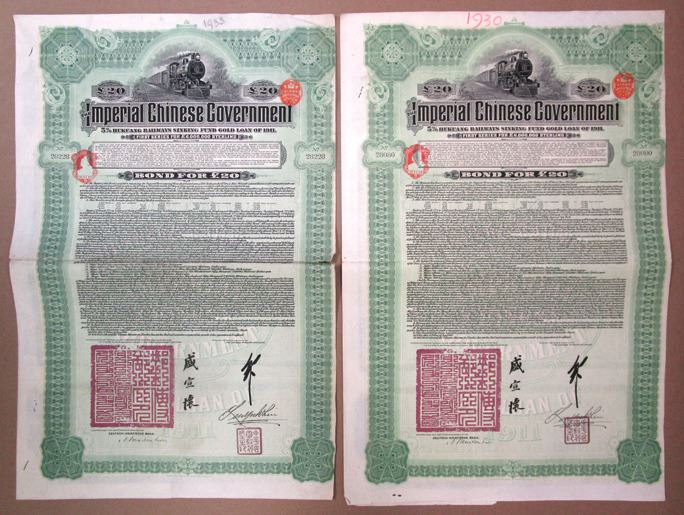 China, 1911. Lot of 2, £20, I/U 5% Sinking Fund Gold Coupon Bonds Issued by the Hongkong and Shanghai Banking Corp., Black printing with green border and underprint on oversized certificate, Train approaching on tracks at top center, S/Ns 28080 & 28228, British Revenue stamps at left and right, VF condition with wear, toning, staple holes, and writing in margins. W&S. (2). Sold "AS IS" no returns accepted.