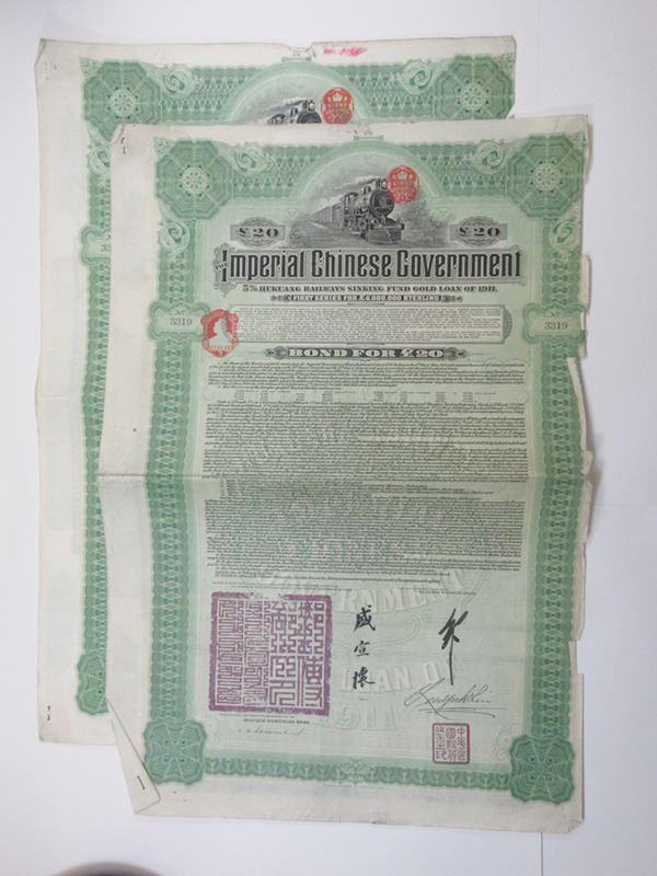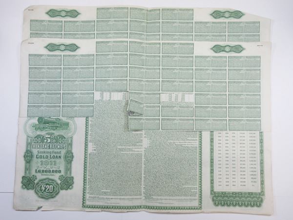 Imperial China. £20 Issued 5% Sinking Fund Gold Loan Coupon Bonds, Black print on large sized green border and under tint printed in English, Locomotive on tracks at top above company title, All ranging from Fine-VF condition, Waterlow & Sons Ltd. 2 Pieces.