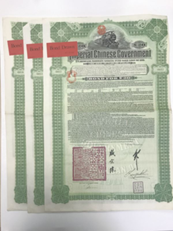 China. Lot of 3 bonds. £20 Issued Sinking Fund Gold Loan Coupon Bond, Black print on large sized green border and under tint, Locomotive on tracks at top above company title, All ranging from Fine-VF condition, Waterlow & Sons Ltd.