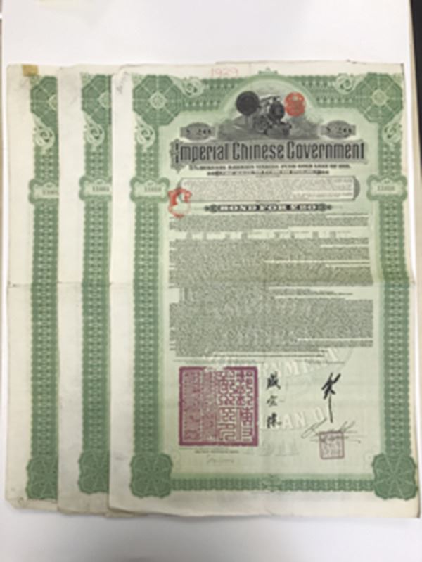China. Lot of 3 bonds. £20 Issued Sinking Fund Gold Loan Coupon Bond, Black print on large sized green border and under tint, Locomotive on tracks at top above company title, All ranging from Fine-VF condition, Waterlow & Sons Ltd.