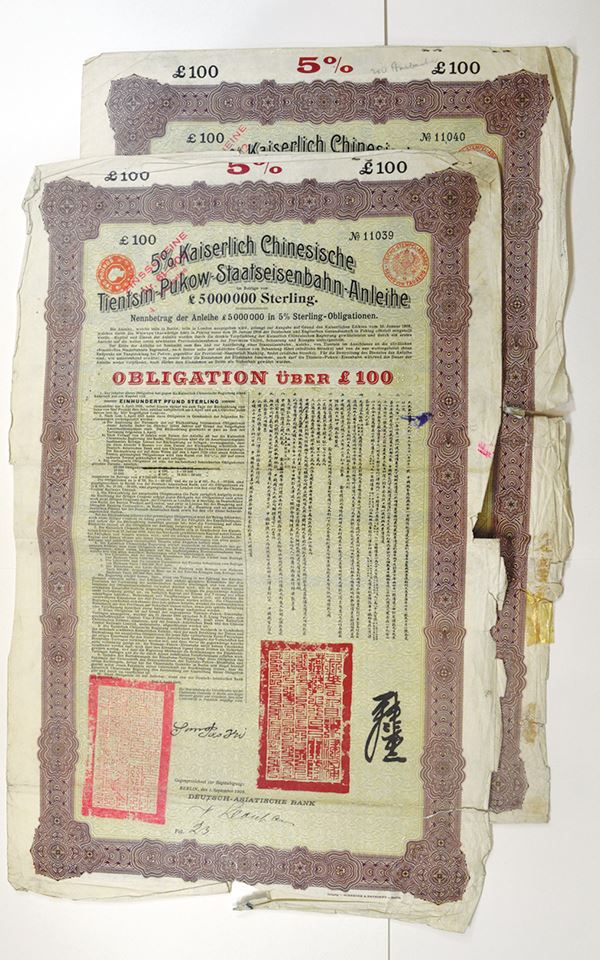 China, 100 Pounds Purple borders, light green underprint. Deutsch-Asiatische Bank. Very Good-Fine. 42 coupons remain on each. 2 pieces.