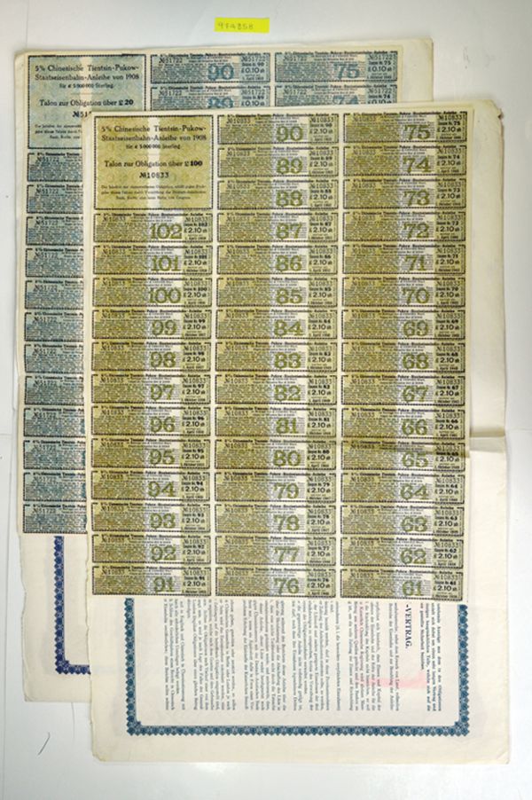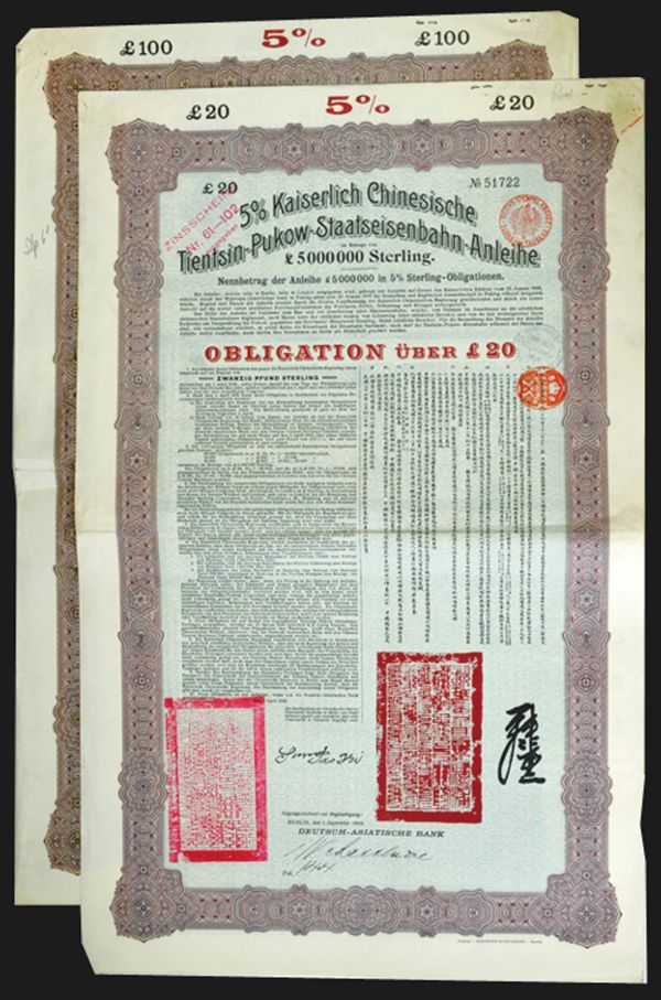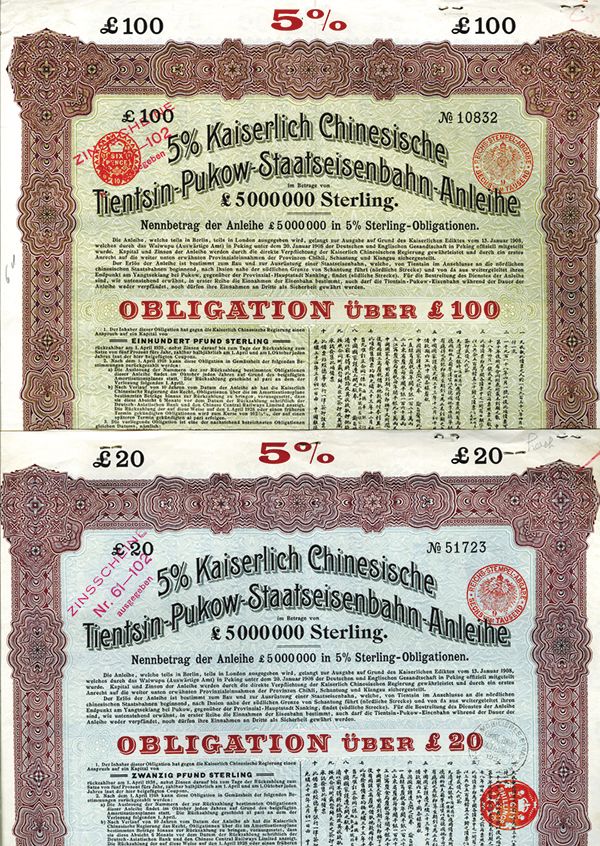 China. 20 and 100 Pounds, brown borders, green tint, Deutsch-Asiatic Bank, VF+, minor edge roughness. [2]