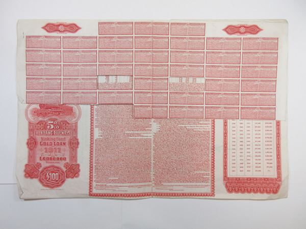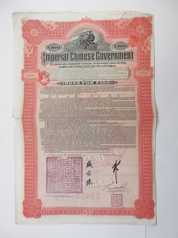 Imperial China. £100 Issued 5% Railway Loan Coupon Bond, Black print on ornate orange border and under tint on large sized certificate printed in English and Chinese, Company title at top, Fine-VF condition, Waterlow & Sons Ltd.