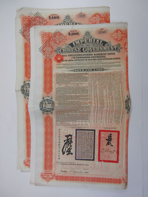 Imperial China. £100 Issued 5% Coupon Bond, Large format with black print on orange under tint printed in German and Chinese. No vignette on certificate, only company title at top, Fine-VF with some edge roughness. 2 pieces.