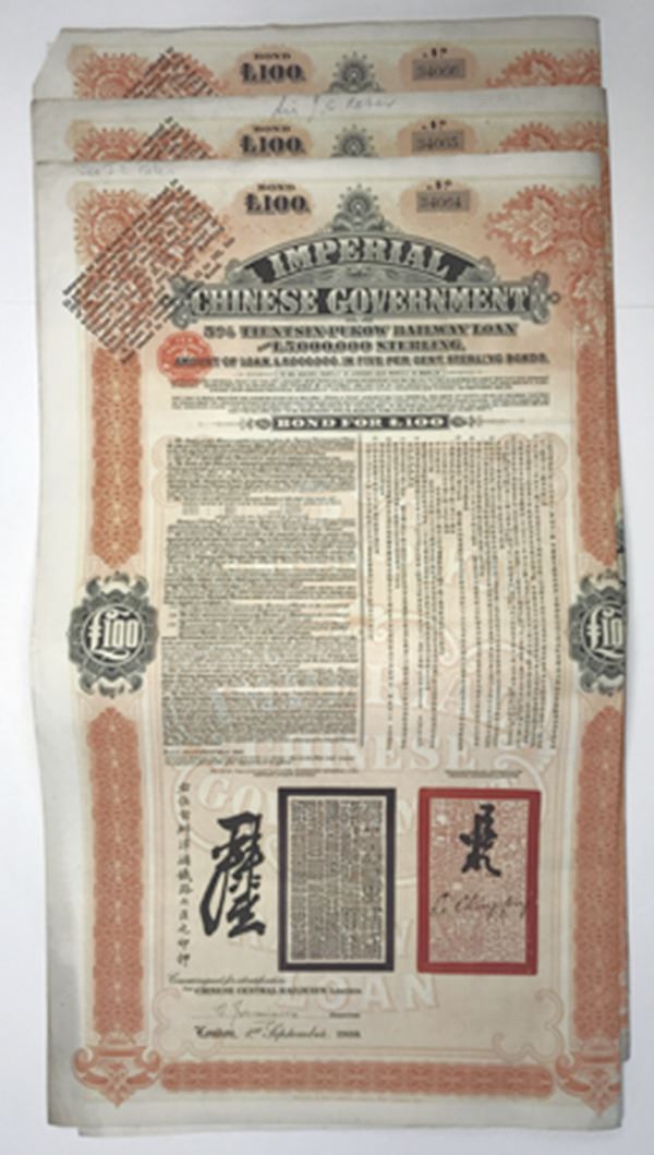 China. Lot of 3 bonds. £100 Issued 5% Railway Coupon Bond, Black print on ornate orange border and under tint on large sized certificate printed in English, Company title at top, Fine-VF condition, Waterlow & Sons Ltd.