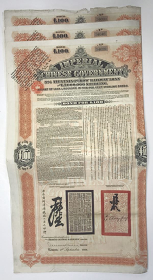 China. Lot of 3 bonds. £100 Issued 5% Railway Coupon Bond, Black print on ornate orange border and under tint on large sized certificate printed in English, Company title at top, Fine-VF condition, Waterlow & Sons Ltd.