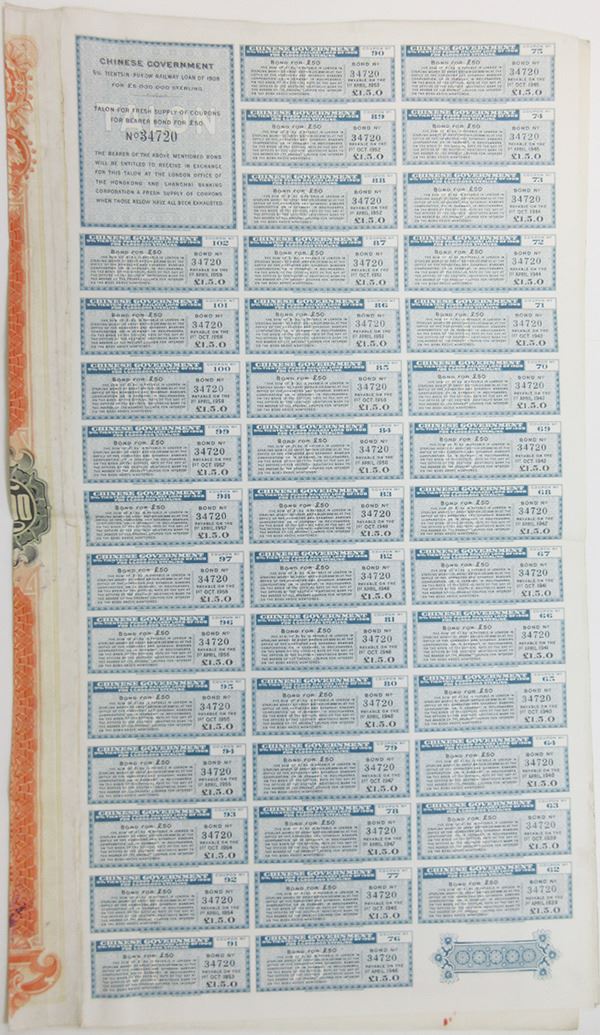 China. £100, 5% Issued Uncancelled Bond. Black print on orange border and under tint on large sized certificate, Company title at top, Printed in English and Chinese, Fine-VF condition, Waterlow & Sons Ltd. Stamp at top left stating "interest on this bond has been reduced to 2 1/2% per annum for the years 1936-1938 ..."