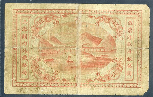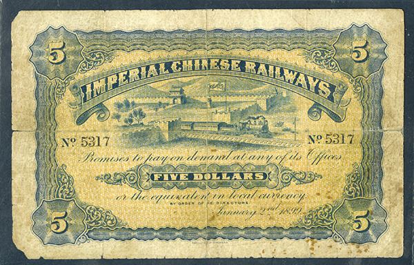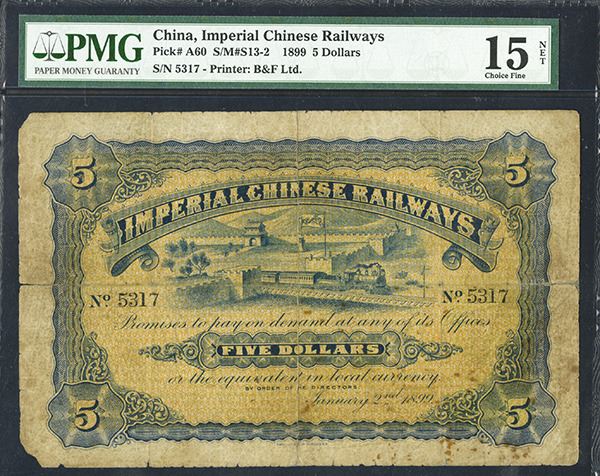 China. 1899, $5, P-A60 (S/M #P13-2), Issued banknote, blue on orange underprint, face with train passing through fortress walls, back orange, S/N 5317, Choice VG to Fine condition. Scarce higher denomination. B&F, Ltd.