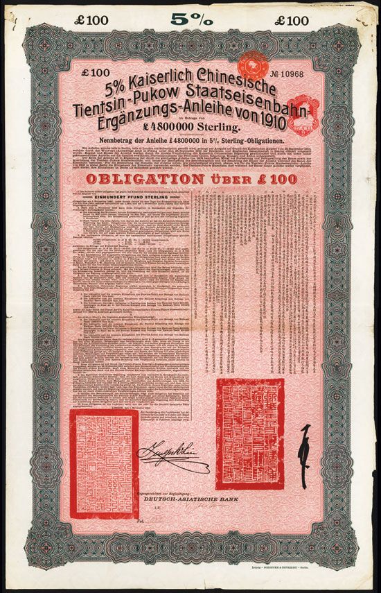 Germany, 1910, 100 Sterling, 5% Issued Bond, Black print with black ornate border and pink underprint, No vignettes, 5 coupons attached, Fine condition, Giesecke & Devrient.