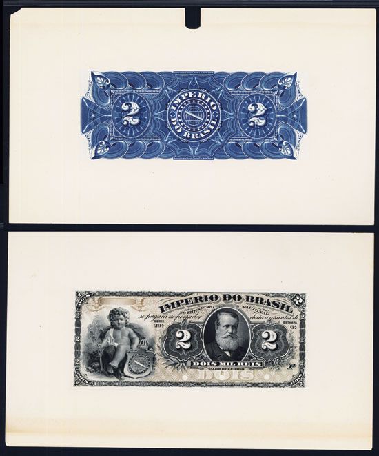 Brazil, ND (1882), 2 Mil Reis, Estampa 6A., Serie 29A, P-A251pe (Printers Essay), Unlisted Color Trial proof banknote face, and back printed on india paper mounted on large cards, Black on light olive brown instead of listed blue, Cherub (Bacchus) and arms at left, Dom Pedro II at right, back blue, No S/N, POC, PMG graded Choice Uncirculated 64, extremely rare if not unique Color Trial that was given the designation ÒPrinter's EssayÓ by PMG. ABNC.