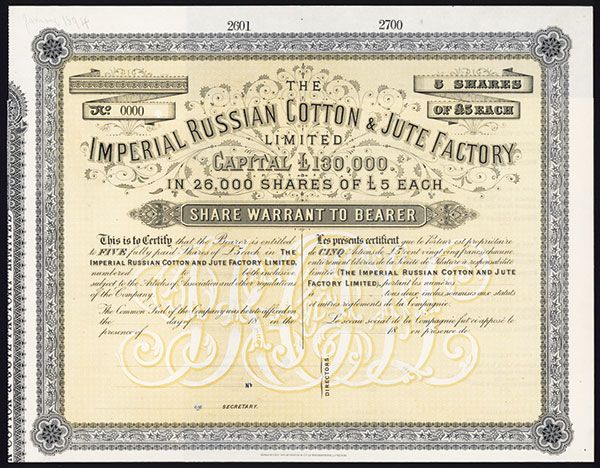 Russia, 18xx (1894), Horizontal, English and French language, 5 Shares of 5 Pounds each, Specimen Stock, Black on light yellow underprint with company initials, Ornate title no vignette, S/N 0000, POC's, Coupons attached, XF to Unc. Condition. Rare Russian related certificate. BWC.