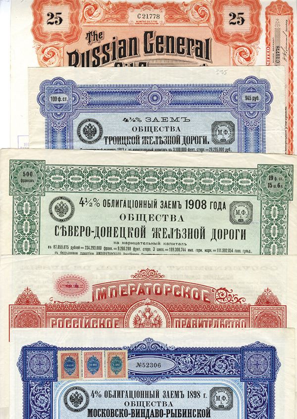 Russia, group of 5 large size bonds, includes 500 German Reichsmarks, 1898, Moscow-Vindav-Rybinsk Railroad; 1250 gold Rubles, 1889, Consolidated Russian 4% Railroad Obligation; 187-1/2 Rubles, 1908, Northern-Donetsk Railroad; 945 Rubles, 1913, Troitzk Railway Co., 10 coupons attached; and 25 shares of the Russian General Oil Corporation, 1913, 15 coupons still attached. Fine to VF condition. (5)