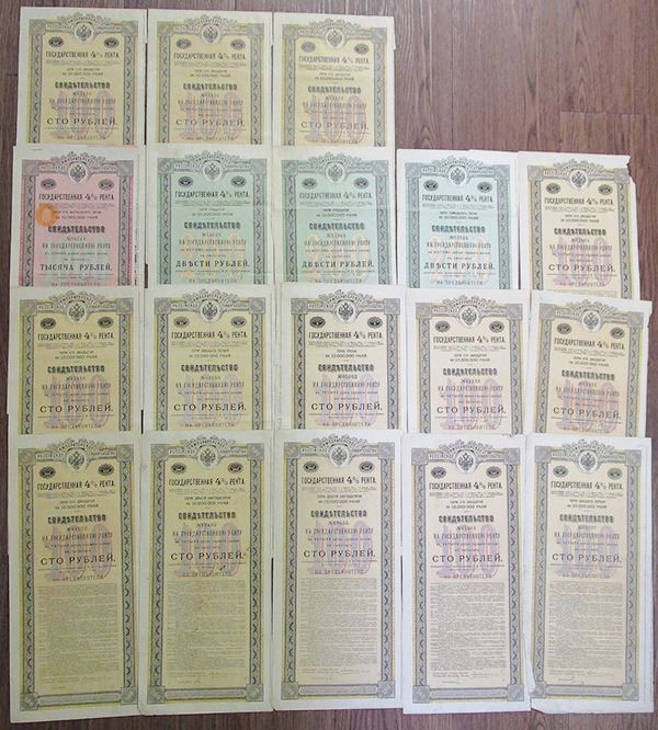 Russia. Lot includes a large group of eighteen 100 Ruble bonds, all the same type as previous lot, with 4% annuity, no coupons remaining. VF+, one with stain, a couple with tears.
