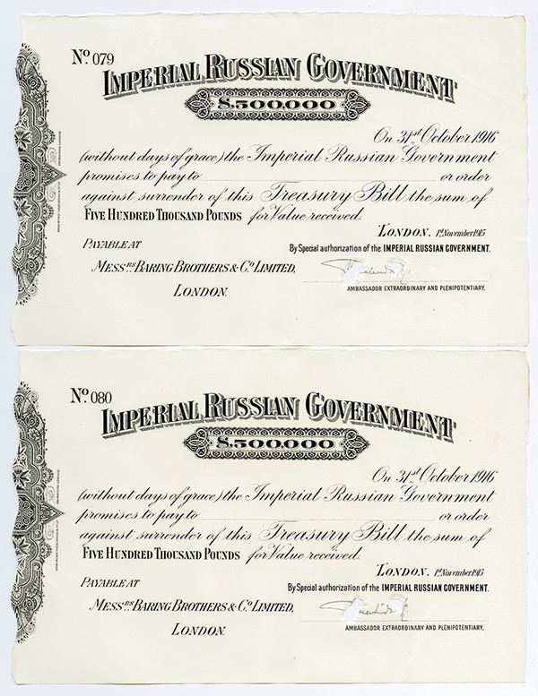 London, England. Lot of 2 Treasury Bills, Issued on 1st November 1915 and Due 31st October 1916. Issued and cancelled £500,000 Treasury Bills, Black on white paper, Counterfoil on left with wavy cut, curved title, Punched out cancels in signature area, S/N's 079 and 080, XF to AU condition. Scarce Russian Pre World War I fiscal documents. BW&C.