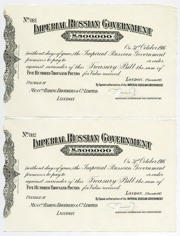 London, England. Lot of 2 Treasury Bills, Issued on 1st November 1915 and Due 31st October 1916. Issued and cancelled £500,000 Treasury Bills, Black on white paper, Counterfoil on left with wavy cut, curved title, Punched out cancels in signature area, S/N's 081 and 082, XF to AU condition. Scarce Russian Pre World War I fiscal documents. BW&C.
