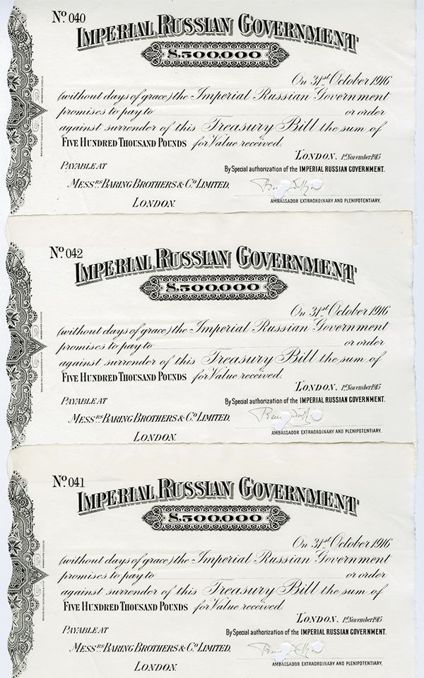 London, England. Lot of 3 Treasury Bills, Issued on 1st November 1915 and Due 31st October 1916. Issued and cancelled £500,000 Treasury Bills, Black on white paper, Counterfoil on left with wavy cut, curved title, Punched out cancels in signature area, S/N's 041; 042 and 043, XF to AU condition. Scarce Russian Pre World War I fiscal documents. BW&C.